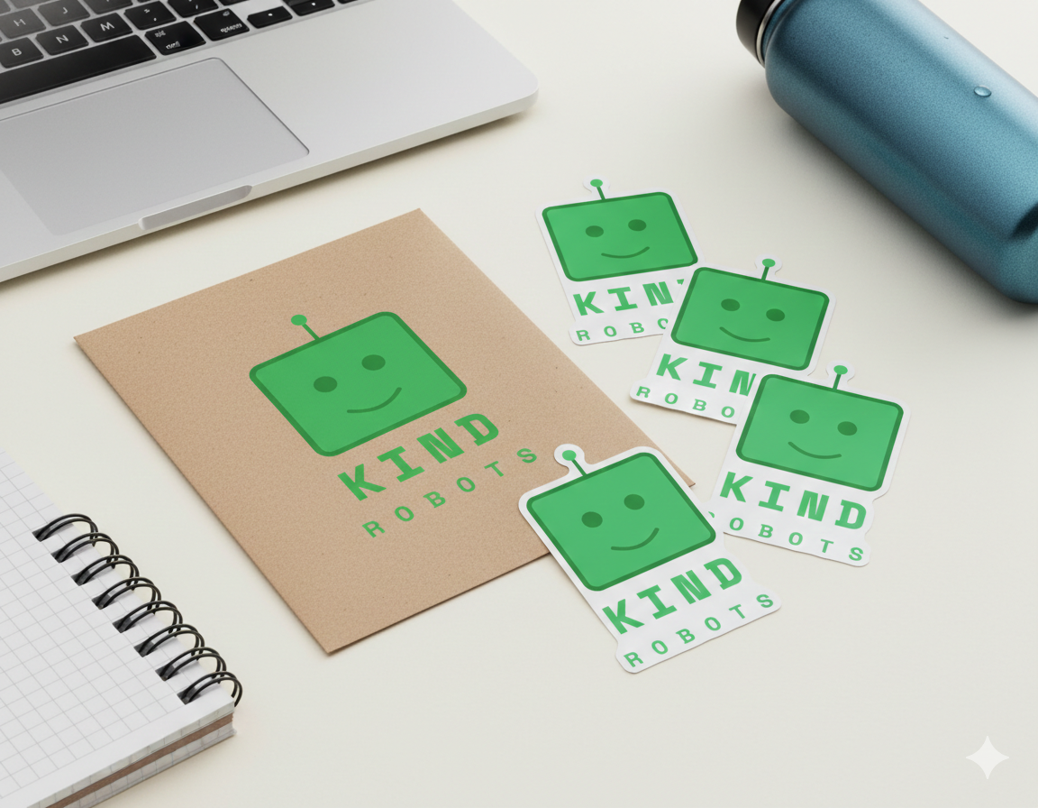 A pack of 5 die-cut stickers featuring the Kind Robots logo in our signature Signal Green. Perfect for laptops, water bottles, and notebooks.