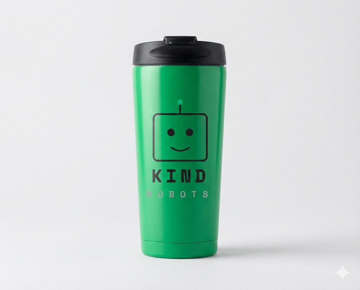 Double-walled stainless steel travel mug with the Kind Robots stacked logo. Keeps drinks hot for 6 hours or cold for 12.